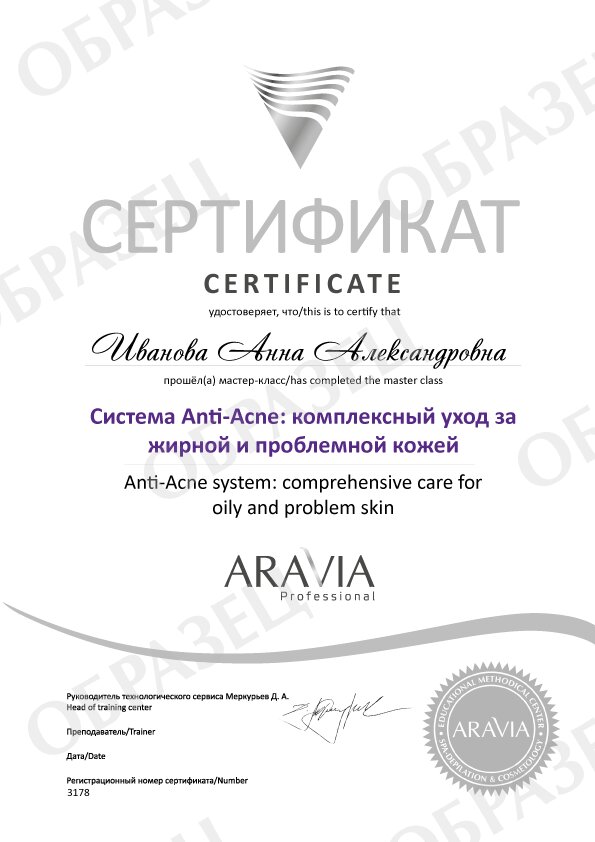 После прохождения мастер-класса участники получат буклет «Система Anti-Acne», буклет «Инновационная линия средств для домашнего ухода за лицом», каталог «Профессиональный уход за кожей лица ARAVIA Professional», прайс-листы и именной сертификат о прохождении мастер-класса по теме «Система Anti-Acne: комплексный уход за жирной и проблемной кожей».