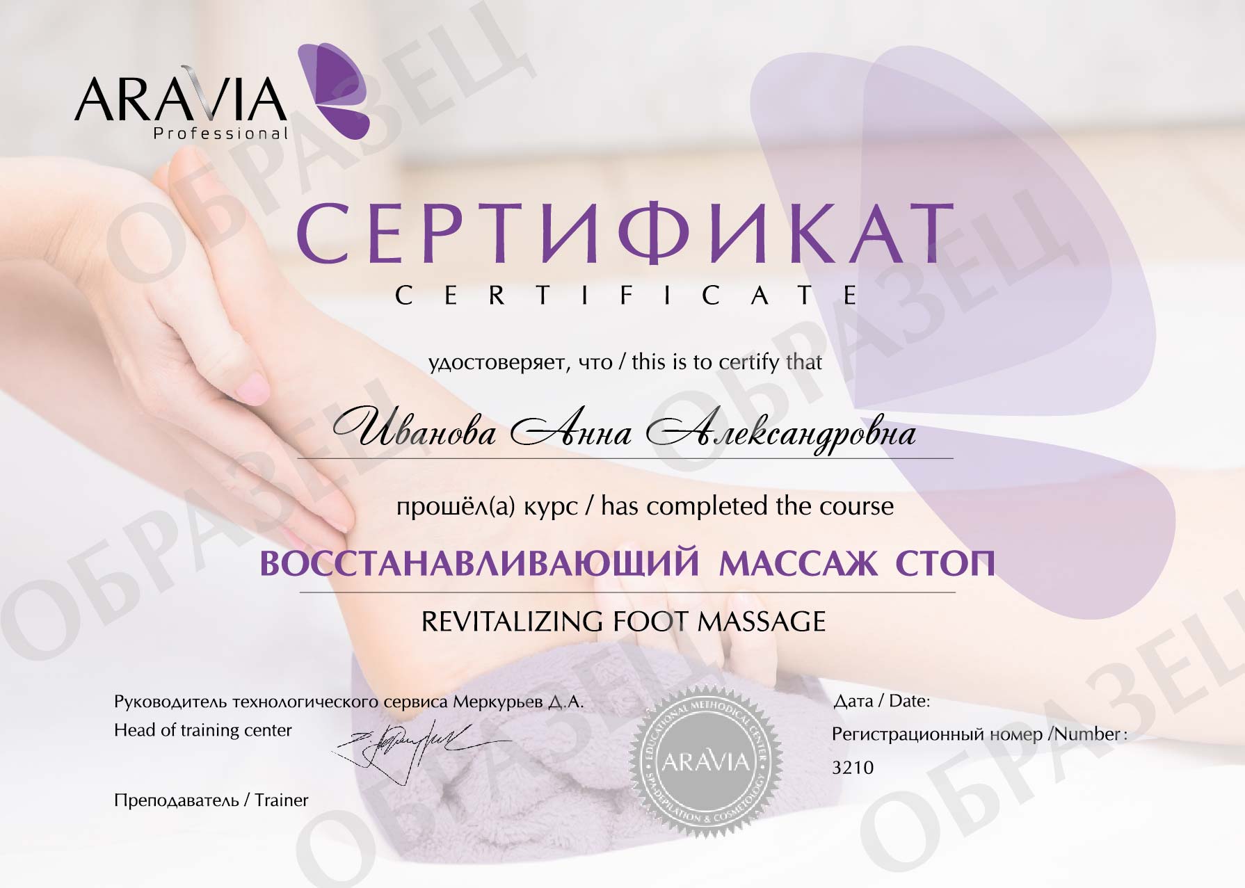 После прохождения курса участники получат прайс-листы, методические пособия, каталоги продукции и именной сертификат о прохождении обучения по направлению «Восстанавливающий массаж стоп». Также мастера получают специальную скидку на весь ассортимент ARAVIA Professional (до 40%).